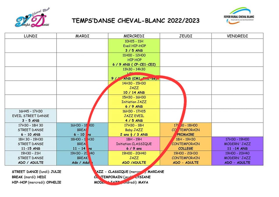 lundi 10h30/ mercredi 9h / jeudi 9h30 19h30 / stretching jeudi 18h30