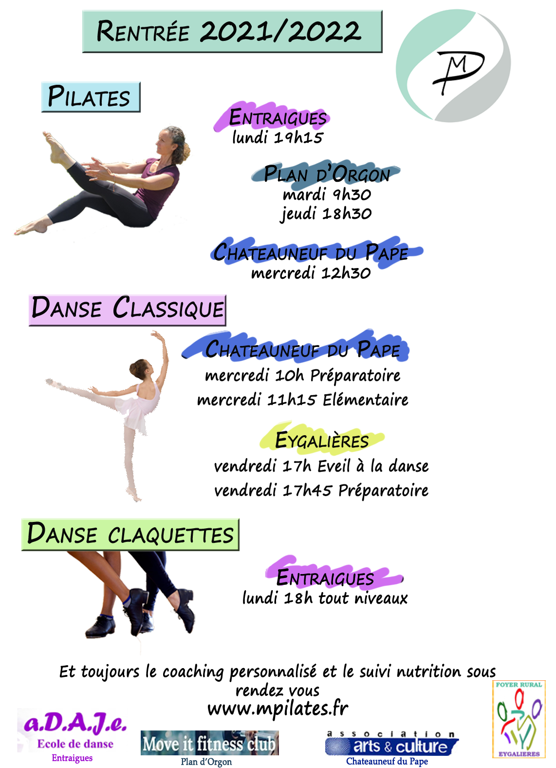 Pilâtes: lundi 10h30/mercredi 9h/ jeudi 9h30 et 19h30/ vendredi 12h30